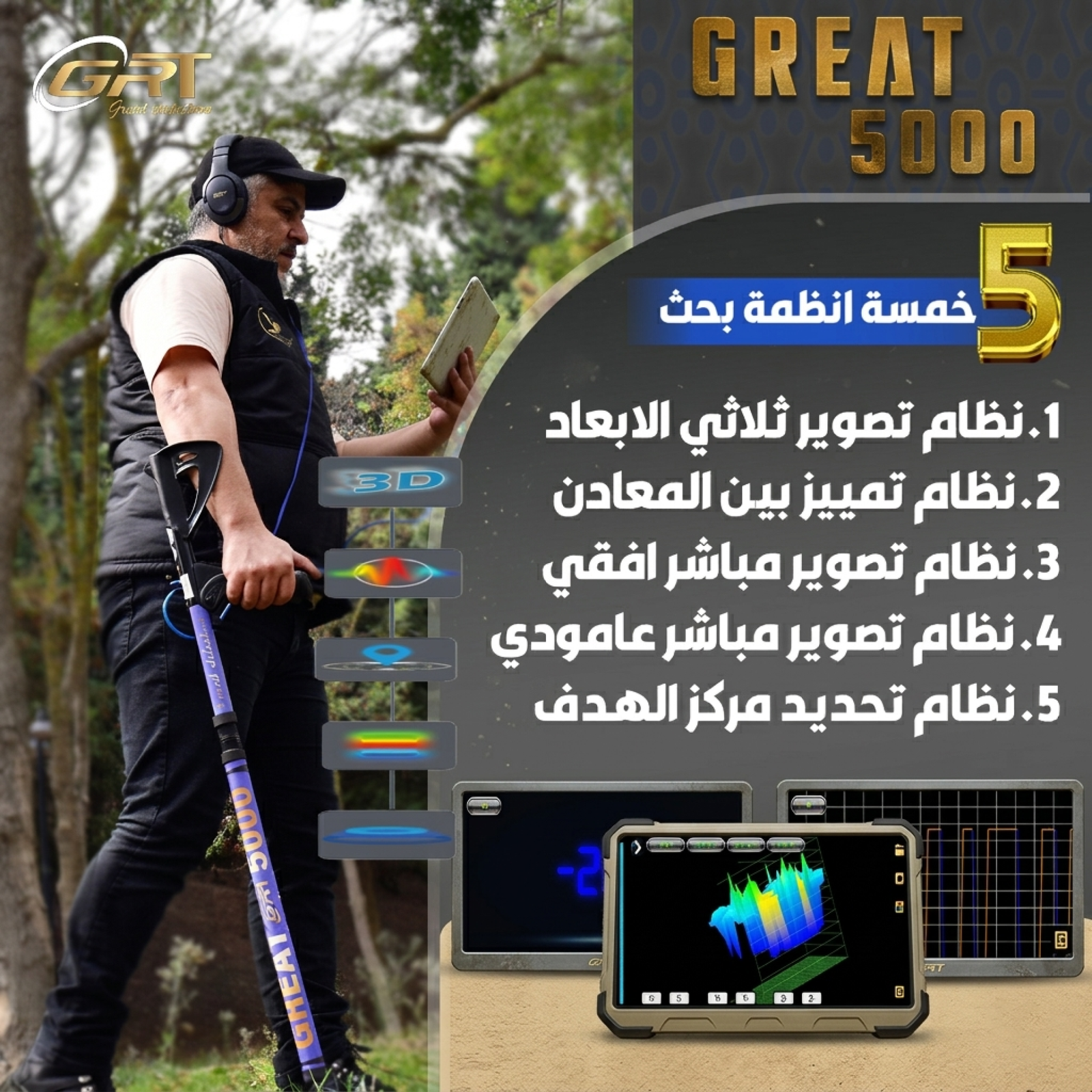* **5 أنظمة بحث تصويرية متقدمة:** رؤية شاملة وواضحة لما تحت الأرض. كل تفصيلة مهمة، وجريت 5000 يضعها بين يديك، لتحديد الهدف وموقعه وعمقه بدقة مذهلة قبل أي خطوة حفر.