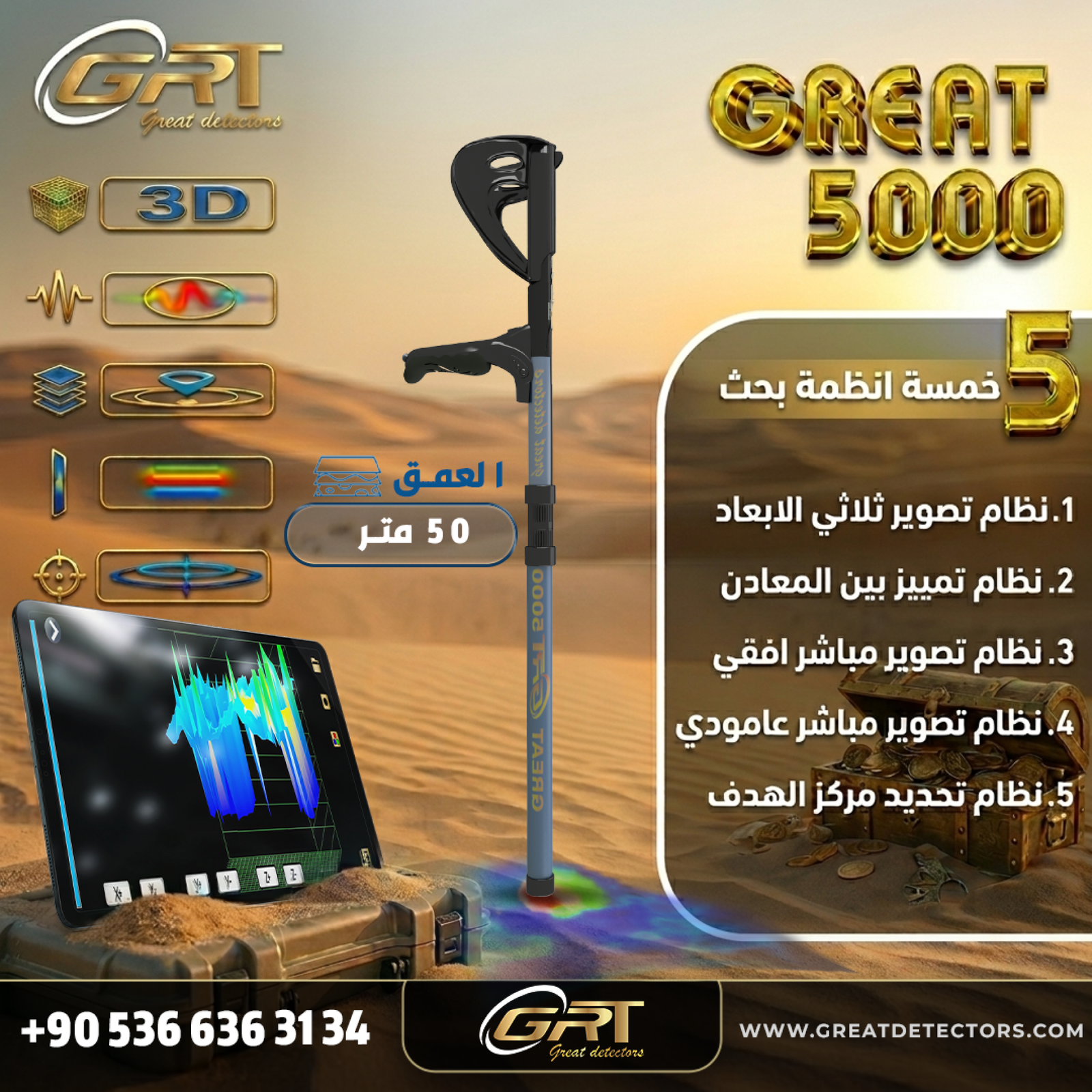 * **عمق كشف يصل حتى 50 مترًا تحت الأرض:** تخيل أن تصل إلى كنوز مدفونة منذ آلاف السنين! هذا العمق الفائق يمنحك تفوقًا حقيقيًا في الوصول إلى الأهداف العميقة التي تعجز عنها الأجهزة التقليدية، ويفتح لك آفاقًا جديدة في عالم التنقيب.