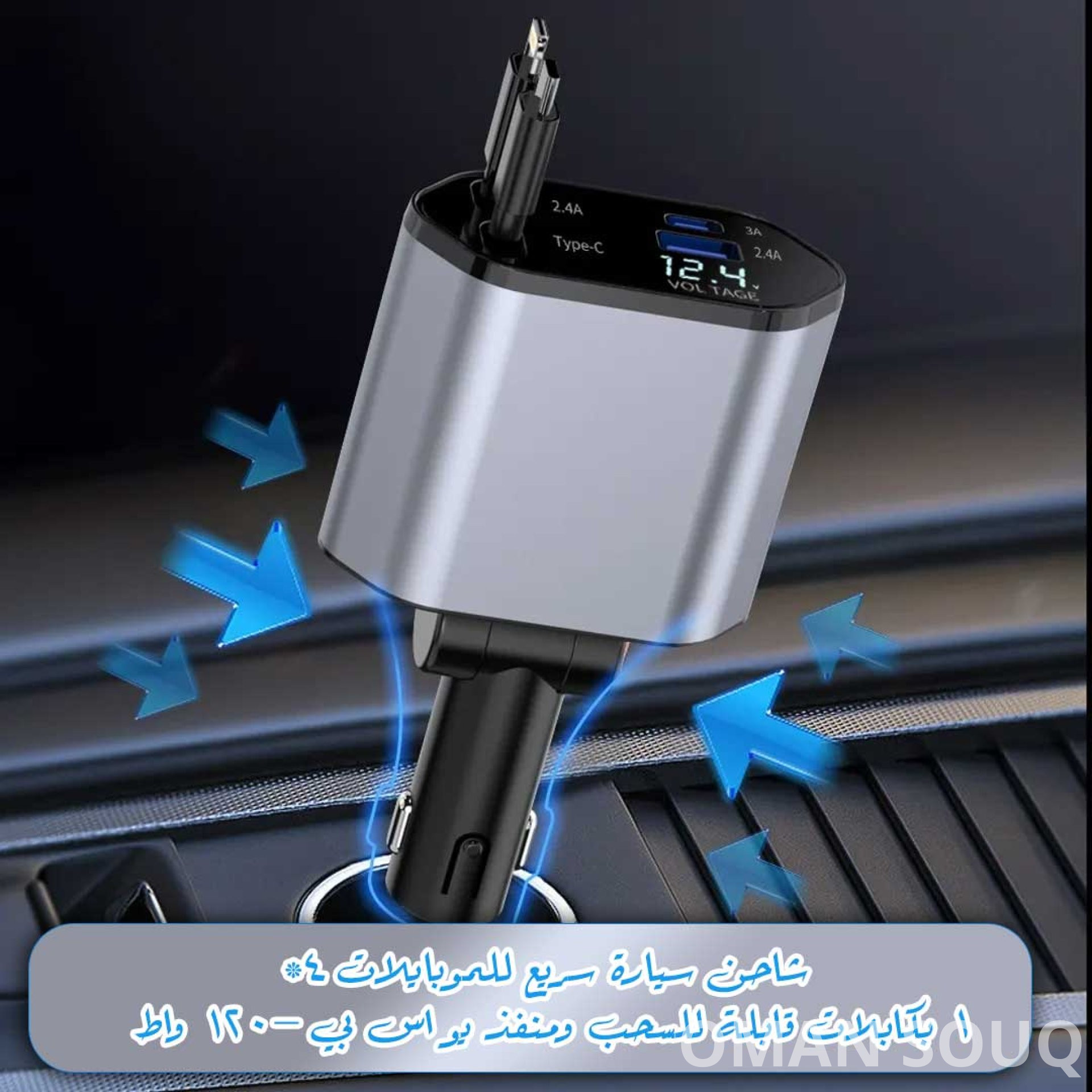 شاحن سيارة فائق القدرة 120 واط مع كابلات قابلة للسحب – الحل المثالي لشحن جميع أجهزتك داخل سيارتك في سلطنة عمان