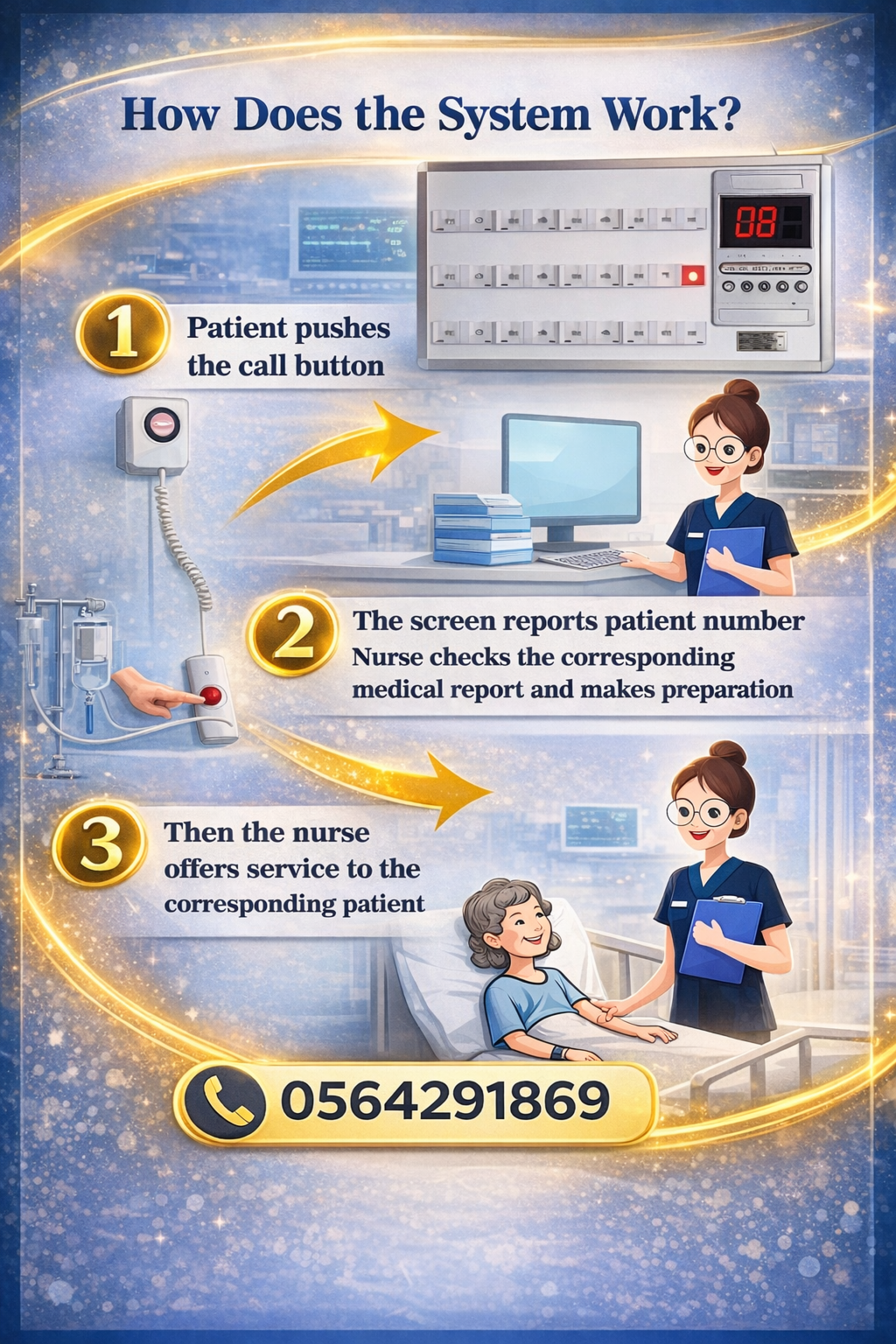 من خلال تنبيه صوتي وضوئي عند مكان تواجد طاقم التمريض وذلك يضمن سرعة الأستجابة لطلب المريض وتقديم خدمة سريعة ومتميزة للمرضى